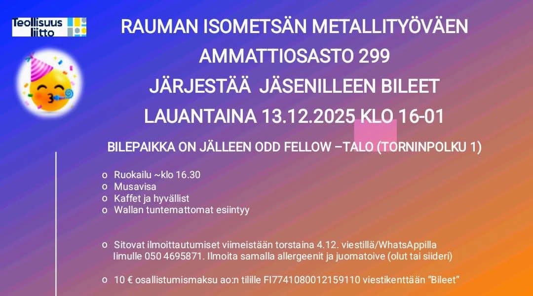 Rauman Isometsän Metallityöväen Ammattiosasto 299 järjestää jäsenilleen bileet lauantaina 13.12.2025 klo 16.00-01.00.