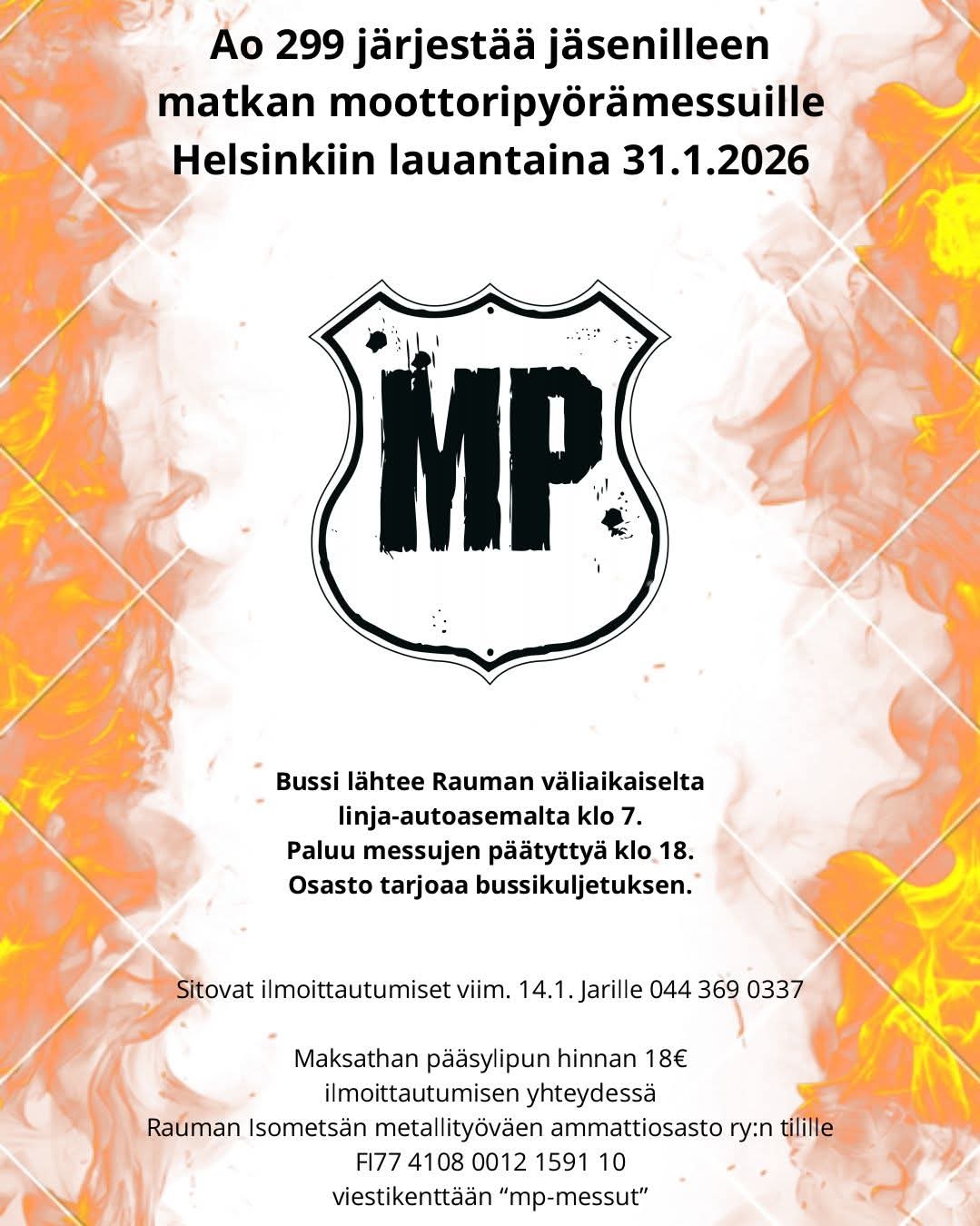 Ao299 järjestää matkan jäsenilleen moottoripyörämessuille Helsinkiin lauantaina 31.1.2026